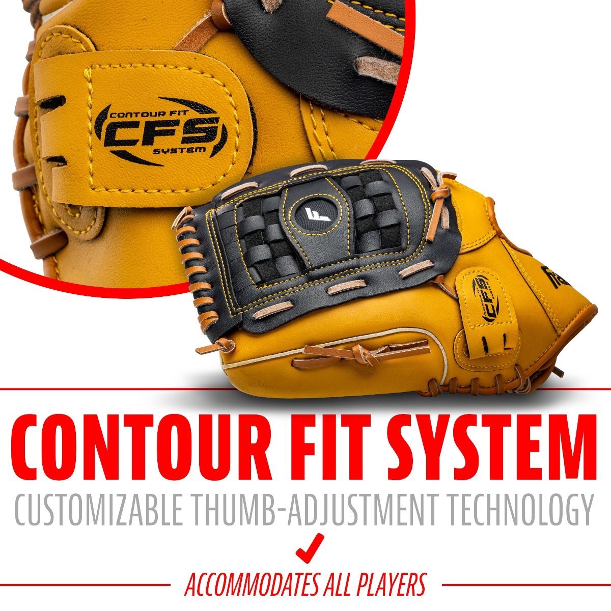 CONTOUR FIT SYSTEM: Customizable thumb-adjustment technology engineered to expand or tighten to help achieve the perfect snug fit to accommodate all players